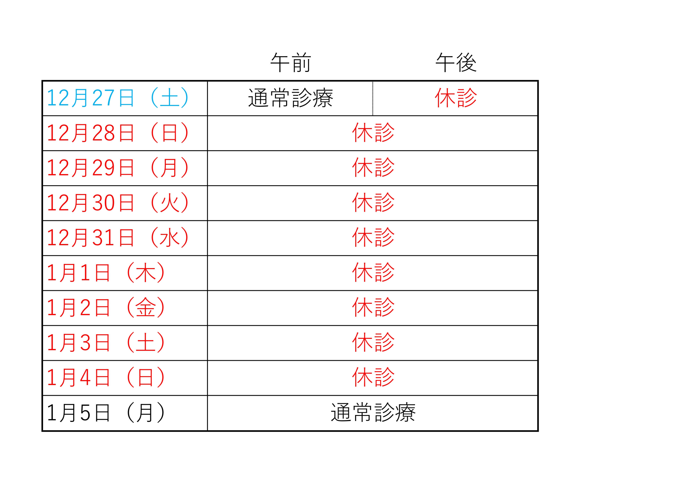 12/27(土)は13:00(受付12:30)までの診療になりますのでご注意下さい。